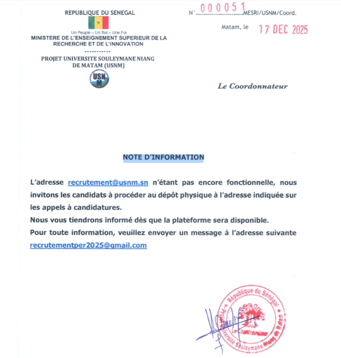 L'adresse "recrutement@usnm.sn" n'étant pas encore fonctionnelle, nous invitons les candidats à procéder au dépôt physique à l'adresse indiquée sur les appels à candidatures.